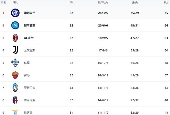 在积分榜上,国际米兰遥遥领先。国际米兰24胜3平5负,拿到75分。而本轮那不勒斯和AC米兰都丢分了,让国际米兰的优势继续扩大。那不勒斯66分排名第2,落后国际米兰9分。AC米兰只拿到63分,排名第3。尤文图斯60分,排名第4。科莫输球后依然是58分,无缘超越尤文图斯,排名第5。罗马以57分排名第6。第7的是亚特兰大,拿到53分。