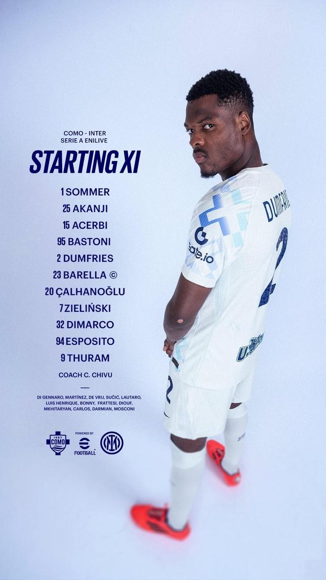 国际米兰首发:1-索默、25-阿坎吉、15-阿切尔比、95-巴斯托尼、2-邓弗里斯、23-巴雷拉、20-恰尔汗奥卢、7-泽林斯基、32-迪马尔科、94-皮奥-埃斯波西托、9-马库斯-图拉姆