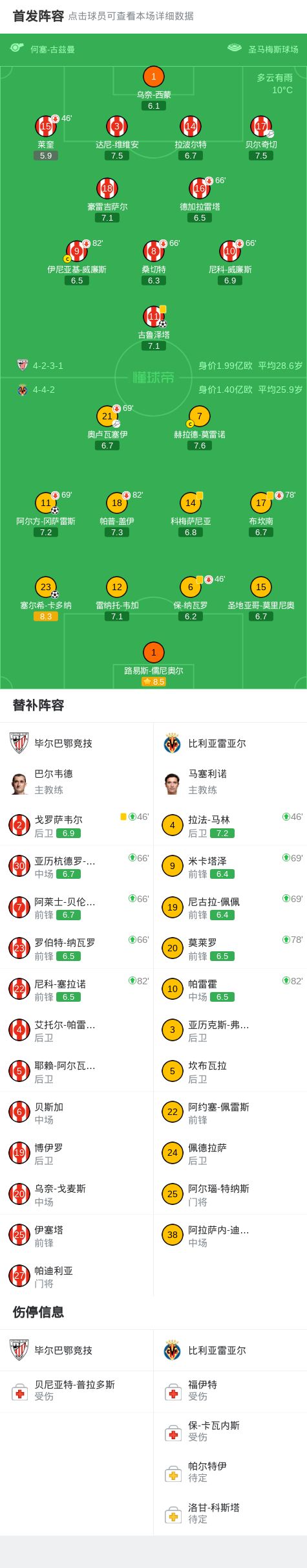 北京时间4月13日西班牙足球甲级联赛 联赛 第31轮,毕尔巴鄂竞技主场对阵比利亚雷亚尔。毕尔巴鄂竞技古鲁泽塔破门。比利亚雷亚尔塞尔希-卡多纳破门,阿尔方-冈萨雷斯破门。最终比分毕尔巴鄂竞技 1-2 比利亚雷亚尔。