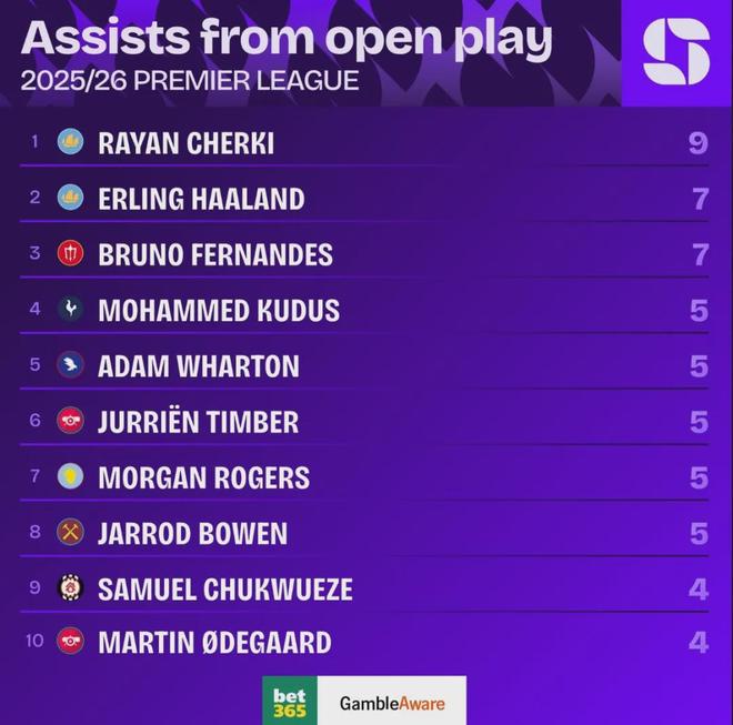 注意这是运动战助攻,前两名是曼城的切尔基和哈兰德。切尔基这个赛季很生猛,我想枪迷对他在卡拉宝杯决赛中的表现印象深刻,曼城战胜切尔西的比赛,切尔基再次发挥了重要作用。