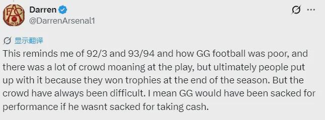 关于阿森纳目前踢球风格在枪迷间引起的“文化之争”,此前阿森纳的小股东以及知名枪迷KOL,推主Darren表示:目前的情况让他想起了92-93以及93-94赛季,当时乔治-格拉汉姆的足球非常丑陋。观众当时对比赛有很多抱怨(所谓“闷蛋阿森纳”时期),但最终人们还是忍了,因为赛季末他们赢得了奖杯。但观众一直都很挑剔。当年乔治-格拉汉姆即便不是因为收受现金(球员转会中收好处费了)问题被解雇,也有可能因为球队糟糕的打法被炒鱿鱼。