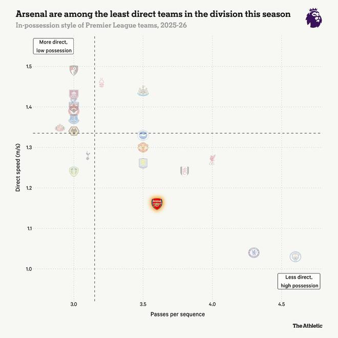 从下面的可视化图表可以看出,阿森纳是联赛中控球时更有耐心的球队之一。本赛季许多球队都倾向于用很少的传球打直接足球,而曼城和切尔西等球队则继续进行着长传次数的配合。在赛季这么晚的阶段,彻底改变风格不太可能,但“踢得快”并不总是意味着“踢得直接”。