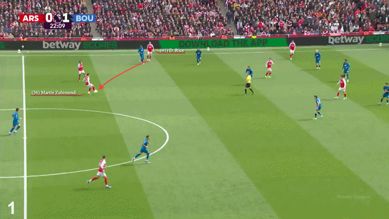 当从赖斯那里接到球后,他向前观察并希望有一个出球点。马丁内利、哲凯赖什和哈弗茨几乎没有任何跑动,伯恩茅斯的防线稳如磐石。苏比门迪被迫自己转身,再次寻求出球点,最后将球分给了身边的刘易斯-斯凯利。