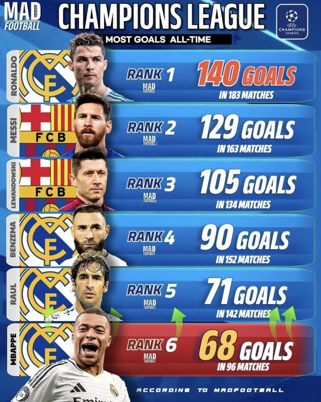 现在的欧冠,大家不该只盯着梅罗留下的那些旧账。真正的看点是姆巴佩到底能把这个天花板捅多高。他现在96场进了68球,已经杀到历史第六了。虽然离C罗还有72球的差距,但他手握最大的筹码:年轻,还有欧冠改制带来的“刷分红利”。