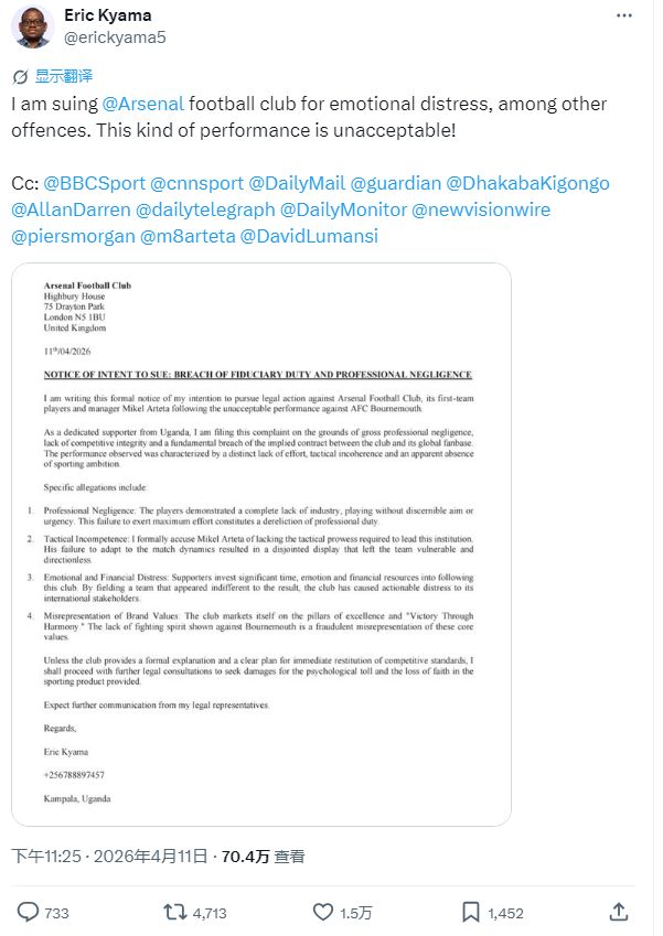 阿森纳的恐慌情绪从球场内扩散到看台,甚至国外。一名乌干达的阿森纳球迷在社媒账号贴出准备起诉阿森纳的警告信,信中指责阿森纳管理层渎职、战术混乱,令球迷遭受情感和经济损失。近期表现证明球队缺乏努力和竞技雄心,无法体现俱乐部“追求卓越”的价值观。这位非洲球迷声称若球队再拿不出立刻恢复竞技水准的计划,将以受到“精神创伤”为由起诉阿森纳并索赔。警告信迅速在社媒平台走红,大量球迷的不满情绪蔓延,又带给了球队更大的心理压力。