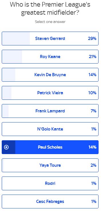 在球迷投票环节,杰拉德同样以29%的得票率排名榜首,其次则是罗伊-基恩(21%)。斯科尔斯、德布劳内同样得到14%的投票。从这一投票结果来看,球迷在斯科尔斯的历史地位上无法认同卡拉格的观点。