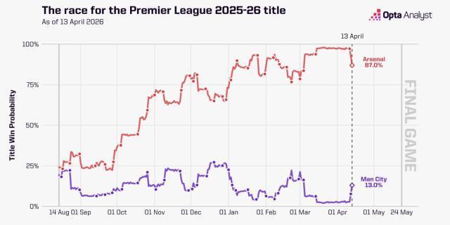 虽然经常有算错的时候,但Opta的超算大模型目前的确仍将阿森纳视为是英超冠军的第一热门。通过1万次模拟,超算算出阿森纳仍有87%的夺冠概率,这相比此前的90%已经降了不少,但对比曼城的13%依旧是“巨大优势”。这一回超级计算机能算对吗?我们拭目以待。
