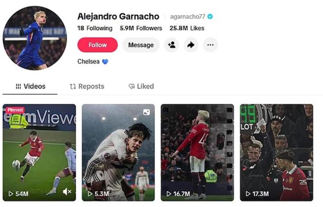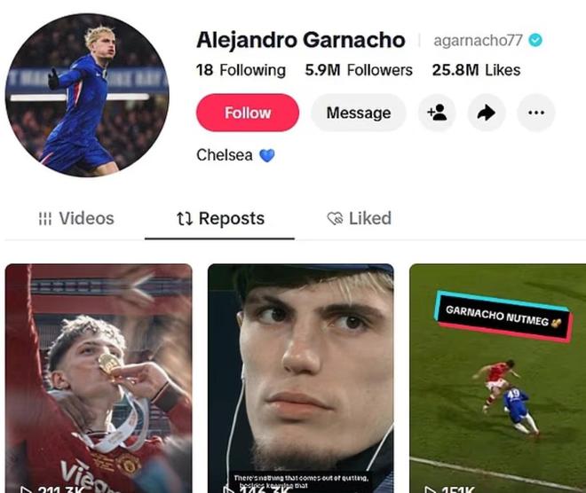 目前,加纳乔的TikTok账号中已找不到任何切尔西相关内容,仅存的四条视频均来自他身披曼联球衣的时期。不仅如此,他还转发了一条球迷制作的曼联怀旧向剪辑,内容正是向他本人致敬。