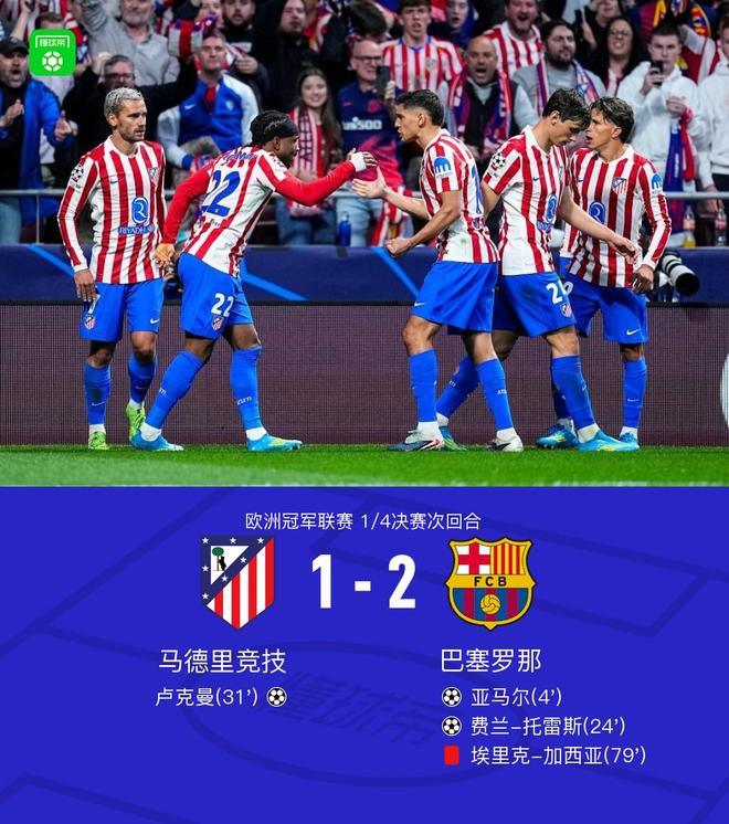 巴萨总分2-3马竞无缘欧冠4强,亚马尔闪击,埃里克-加西亚直红