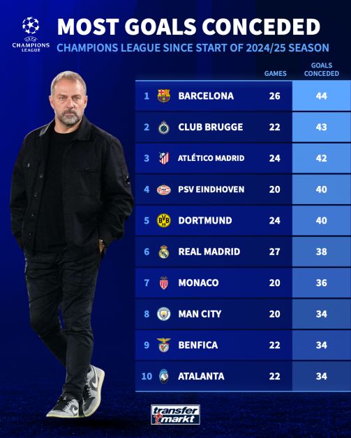 问题是巴萨丢球也多,过去两个赛季他们在欧冠丢了44球,是所有球队里最多的。只有布鲁日(43球)和今晚的对手马竞(42球)接近这个数字。