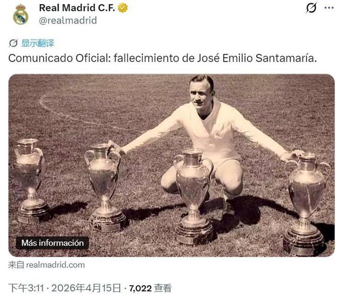4月15日,皇家马德里俱乐部在官方宣布,“本俱乐部和世界足坛最伟大的传奇人物之一”何塞-埃米利奥-桑塔玛利亚不幸去世,享年96岁。