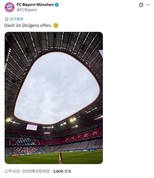 拜仁官方在社交媒体上晒出了慕尼黑安联球场顶部的照片,并配文:“顺便说一句,屋顶是开着的”,疑似回应了皇马首回合将伯纳乌顶棚关闭的举动。