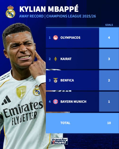 更厉害的是,姆巴佩只用了4个客场比赛就完成了这个纪录。