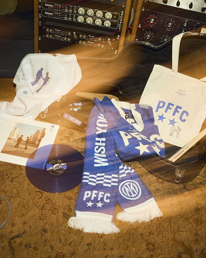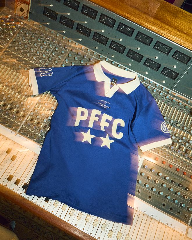 该系列的灵感源自摄影师金-戈特利布-沃克拍摄的经典PFFC合影,其中一大亮点是一款专属复古球衣,以现代视角重塑70年代复古美学,融合平克-弗洛伊德与国际米兰两大品牌标识。球衣正面沿用经典PFFC字母标识,还原历史照片中原款球衣样式;背部则印有专为俱乐部定制的《愿你在此》专辑50周年纪念徽章。衣袖点缀国米队徽,以及专辑封面传世经典的握手图案——平克-弗洛伊德最具代表性视觉符号。围巾、托特包、吉他拨片、鼓槌等周边单品,也均沿用同款设计元素。