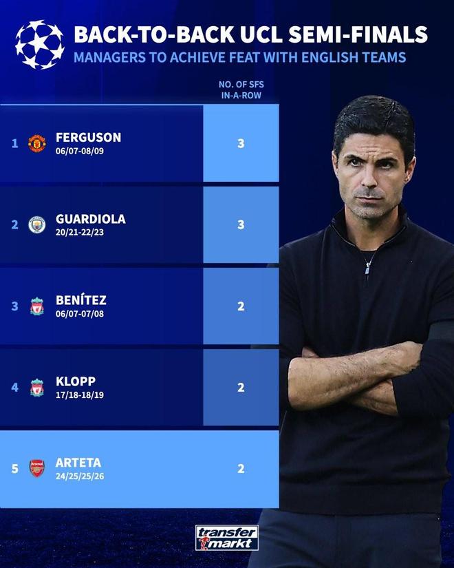 阿森纳连续两个赛季晋级欧冠半决赛,阿尔特塔成为第五位带领英超球队连续闯进欧冠半决赛的主帅。
