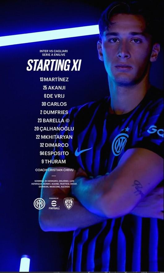 国际米兰vs卡利亚里:恰尔汗奥卢、马库斯-图拉姆首发,米纳、塞巴斯蒂亚诺-埃斯波西托出战