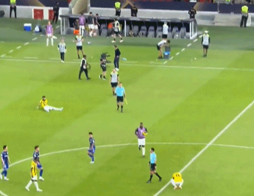 而赛后,或许是对出局结果的失望,又或者对当值主裁马宁判罚的不满,吉达联合队的20号后卫艾哈迈德·沙拉赫利,冲进球场愤怒靠近马宁,随后从身后用胸口冲撞了马宁的背部,不仅如此,他嘴里还叫骂着,态度十分嚣张。