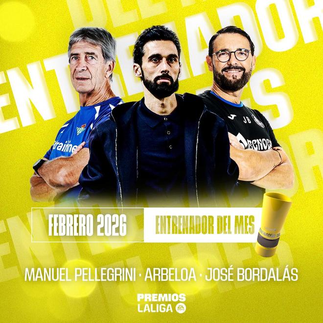 北京时间2月19日,西甲官方公布了2月份最佳主教练候选名单,分别是阿韦洛亚、佩莱格里尼和博尔达拉斯。