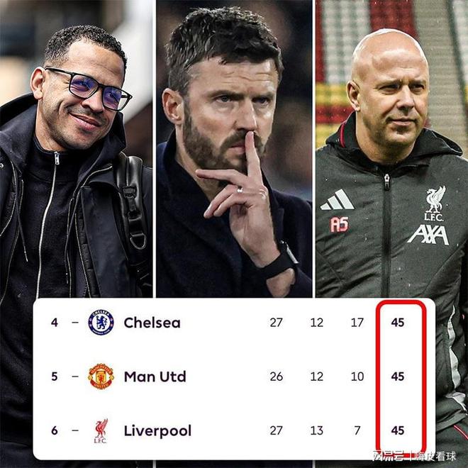 英超第27轮,9场比赛已经结束,静等曼联最后出场。目前,英超积分榜形成一道奇观,切尔西、曼联和利物浦三大豪门,积分相同,都是45分,分别排在第四到第六,其中曼联少赛一场。