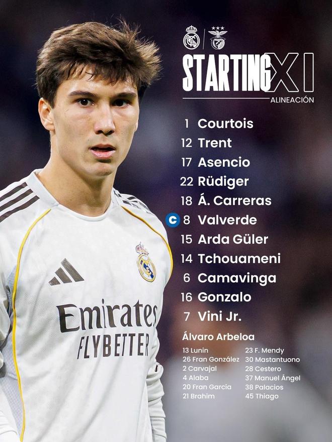 皇马vs本菲卡:维尼修斯搭档贡萨洛,居莱尔、巴尔韦德出战