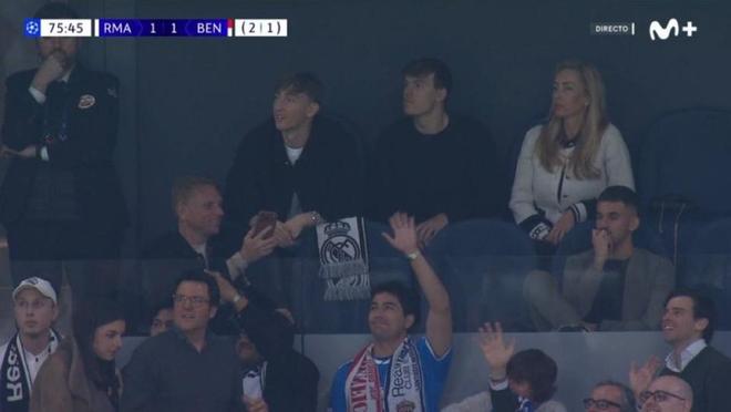 就在这时,作为阿森西奥队友的赫伊森,却在看台上,和身边的人一起,居然在用电话进行视频通话,并且嬉笑打闹。