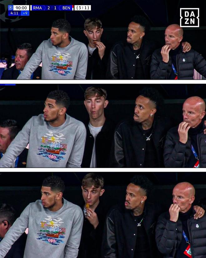 在比赛行将结束时,贝林厄姆、赫伊森、米利唐等来到皇马替补席观赛。当时,贝林厄姆和米利唐认真地观看着场上的局势,而赫伊森则悠闲地吃着食物,四处张望,好似神游物外。