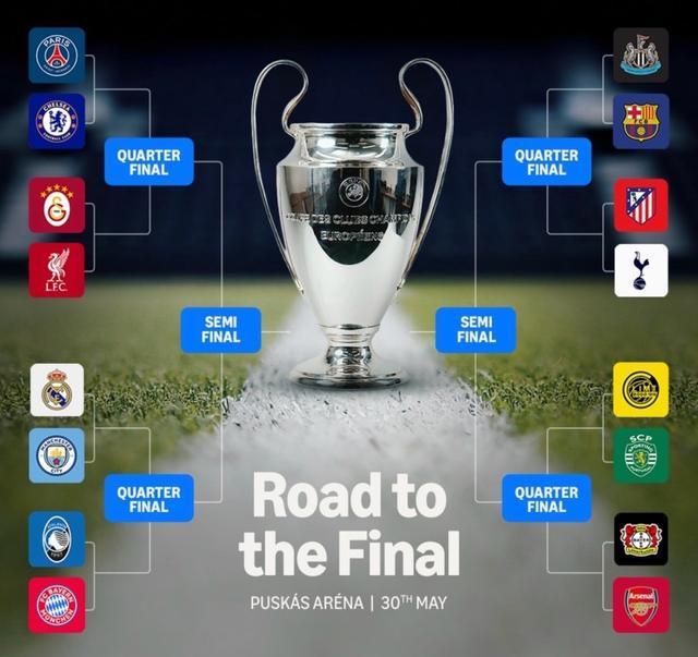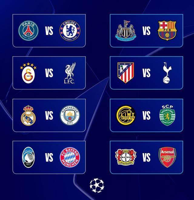 当抽签完成后,本赛季欧冠1/8决赛对阵敲定:巴黎圣日耳曼VS切尔西、加拉塔萨雷VS利物浦、皇家马德里VS曼城、亚特兰大VS拜仁慕尼黑、纽卡斯尔联VS巴塞罗那、马德里竞技VS托特纳姆热刺、博德闪耀VS葡萄牙体育、勒沃库森VS阿森纳。