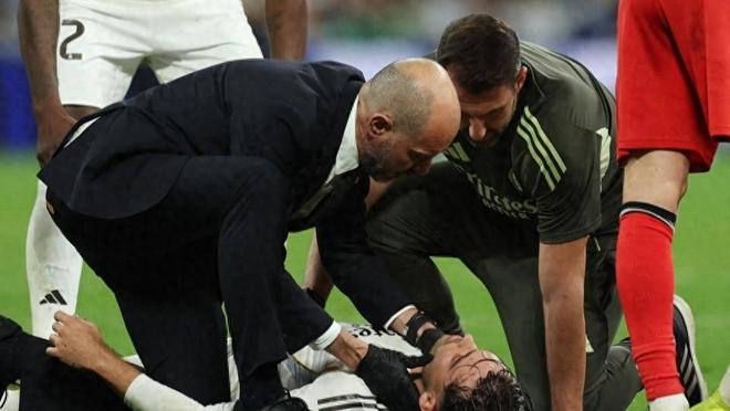 事故发生在下半场开场不久。当时阿森西奥为了争抢头球,与队友卡马文加在空中发生猛烈碰撞。两人重重摔倒在地,阿森西奥更是直接痛苦倒地不起,整个伯纳乌球场瞬间安静下来。