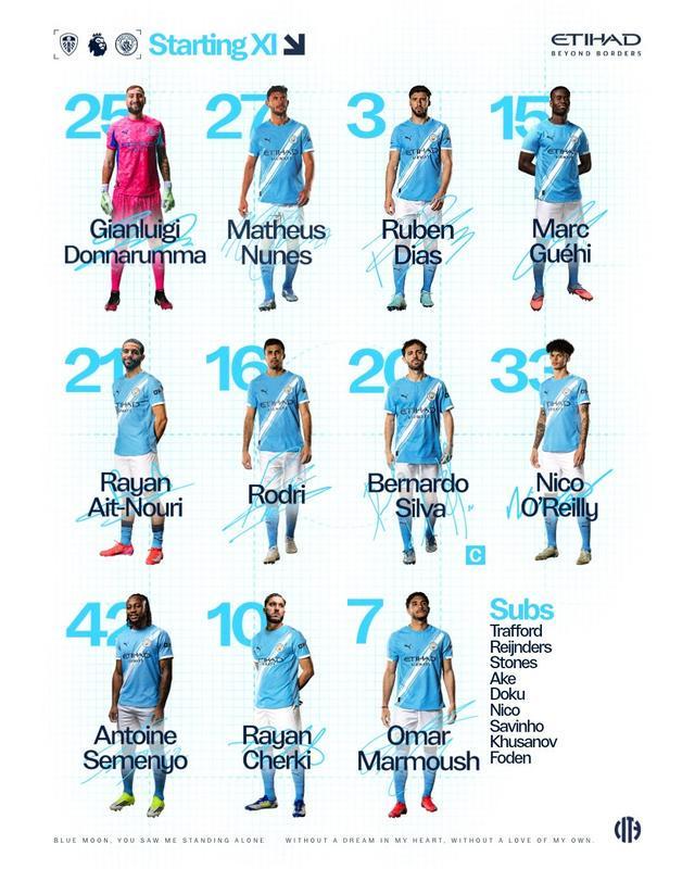 曼城首发:25-多纳鲁马、21-努里、15-格伊、3-鲁本-迪亚斯、27-努内斯、16-罗德里、33-奥赖利、20-席尔瓦、10-谢尔基、7-马尔穆什、42-塞门约