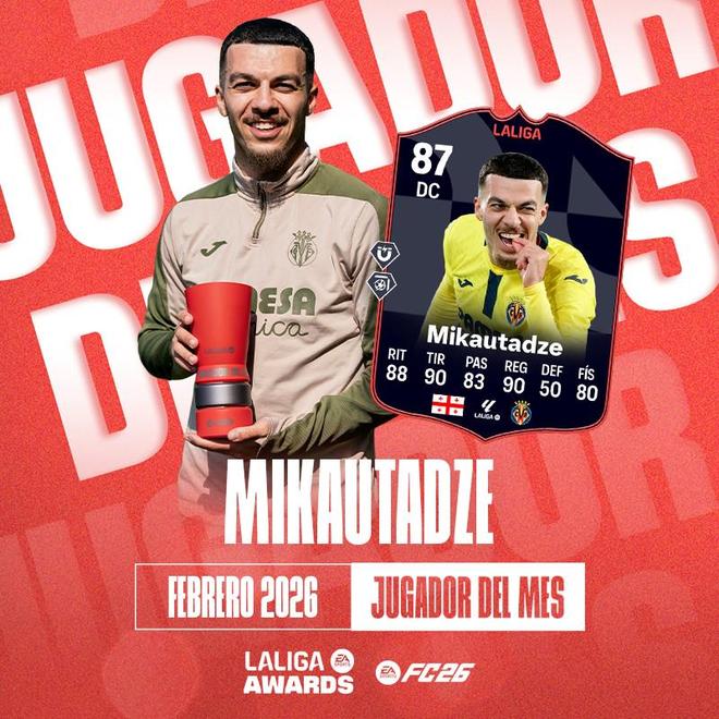 官方消息,比利亚雷亚尔前锋米卡塔泽当选西甲2月最佳球员,这位格鲁吉亚前锋在2月出战的4场比赛中贡献3球1助攻,表现亮眼。