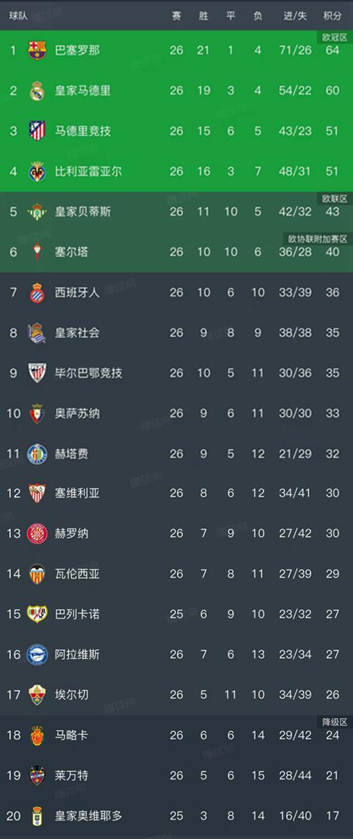 随着皇马0-1不敌赫塔费,西甲最新排名出炉!巴萨领先4分排第1