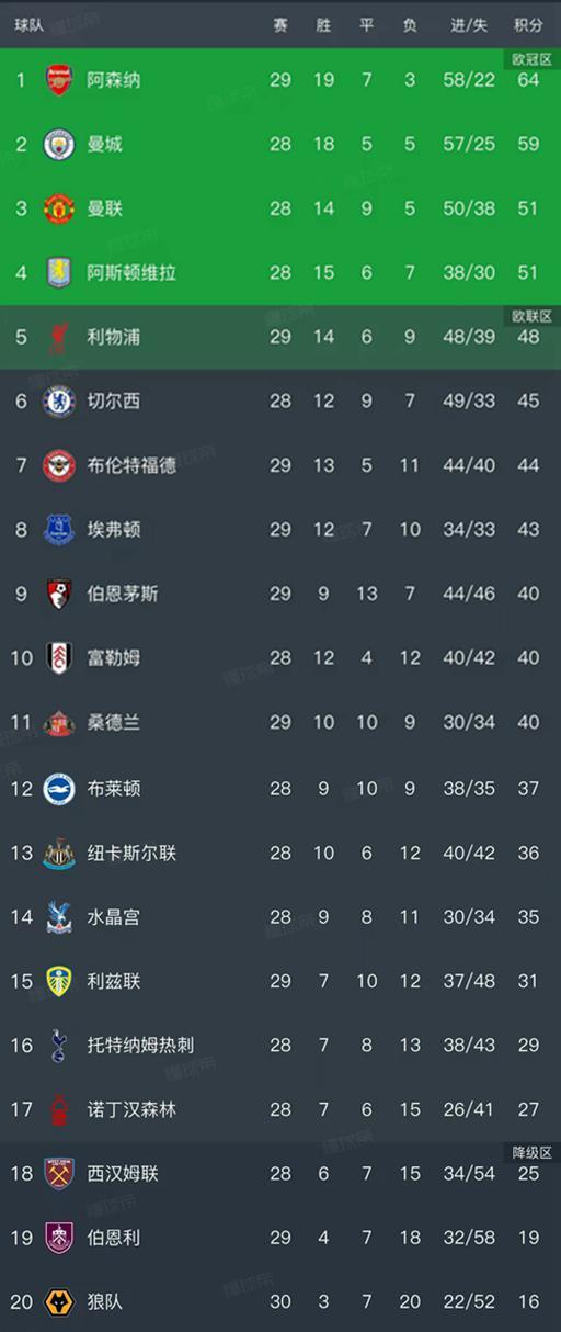 英超最新积分榜