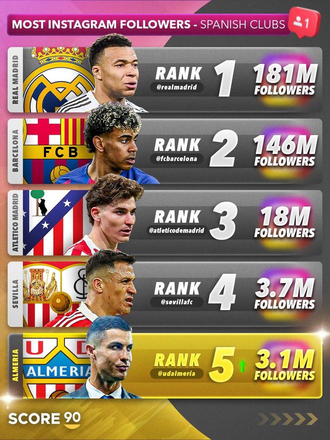 C罗收购阿尔梅里亚后球队社媒粉丝数飙升,跃升至西班牙第五