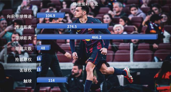 佩德里全场触球114次,丢球权13次,但是自己抢回球权14次。更可怕的是,他带球48次,带球距离长达466.2米,更是组织推进距离达到274.5米,向前带球推进104.9米。