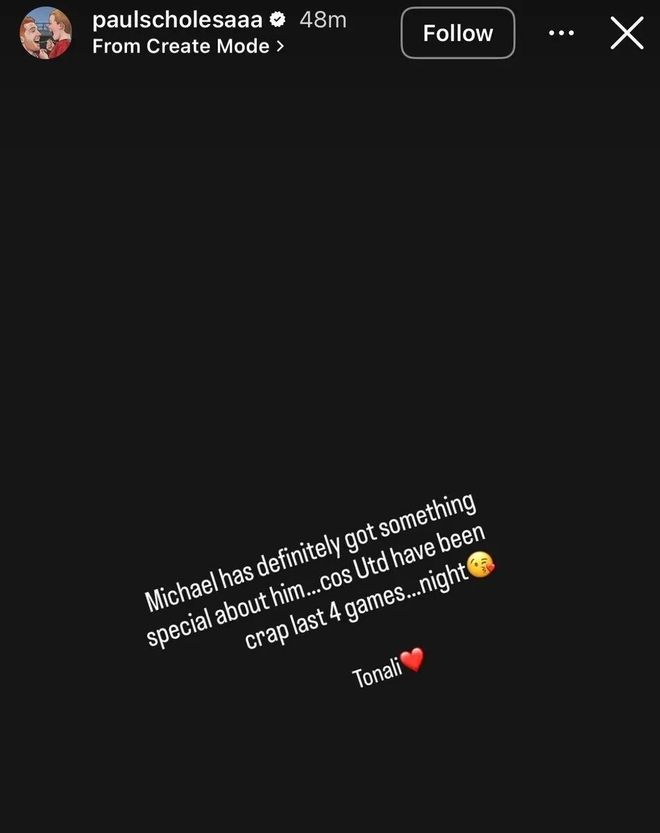 斯科尔斯在社交媒体发文抨击卡里克:迈克尔身上肯定有某种特别之处……因为曼联最近四场比赛踢得烂透了……晚安!托纳利。 ❤️
