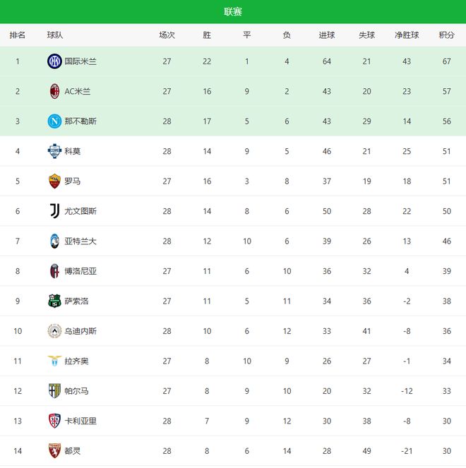 目前,国际米兰依旧牢牢占据榜首位置,以67分遥遥领先。排名第二的是AC米兰,他们目前拿到57分,落后国米10分。卫冕冠军那不勒斯则以56分排在第三。