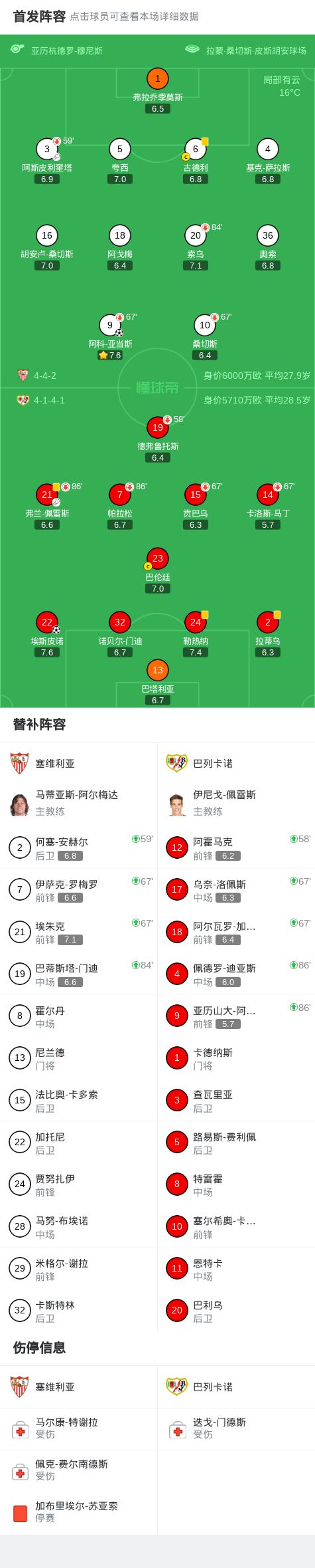北京时间3月9日西班牙足球甲级联赛 联赛 第27轮,塞维利亚主场对阵巴列卡诺。塞维利亚阿科-亚当斯破门。巴列卡诺埃斯皮诺破门。最终比分塞维利亚 1-1 巴列卡诺。