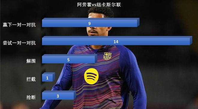 阿劳霍本场比赛尝试了14次一对一对抗,赢下了其中的9次,贡献了3次抢断5次解围和1次拦截。弗里克要求阿劳霍前顶到非常高的位置,这样一来库巴西可以利用自己的球商和空间意识,完成更好的选位。