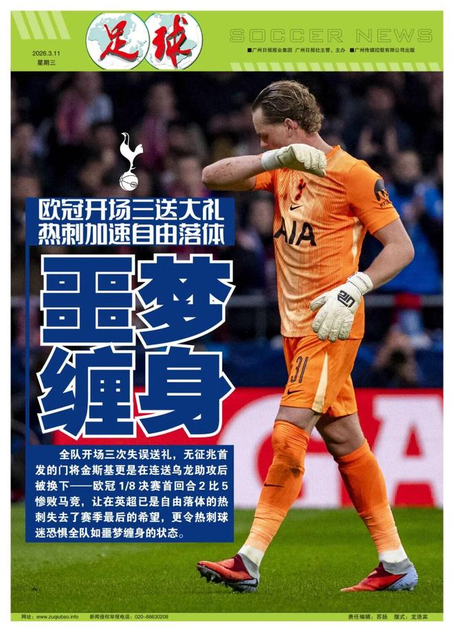 撰稿/寒冰全队开场三次失误送礼,临危受命的22岁门将金斯基更是在连送乌龙助攻后,17分钟就被换下——欧冠1/8决赛首回合2比5惨败马竞,让在英超已是自由落体的热刺失去了赛季最后的希望。尽管同日出战的两支英超球队均未取胜,但客负加拉塔萨雷的利物浦和主场被巴萨绝平的纽卡斯尔联至少仍保留晋级可能,相比之下,热刺全队噩梦缠身的状态,远比三球差距更令人绝望。