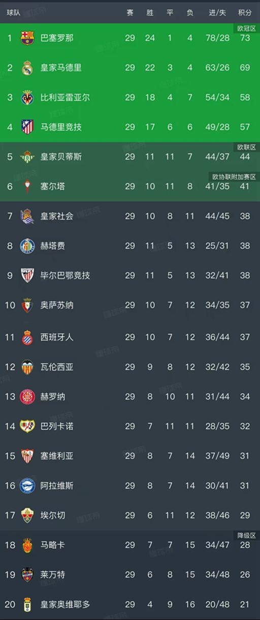 北京时间3月23日,随着皇马3-2力克马竞、毕尔巴鄂竞技2-1皇家贝蒂斯、阿拉维斯-3塞尔塔、巴萨1-0小胜巴列卡诺的比赛结束,西甲第29轮结束了全部比赛,最新排名如下!