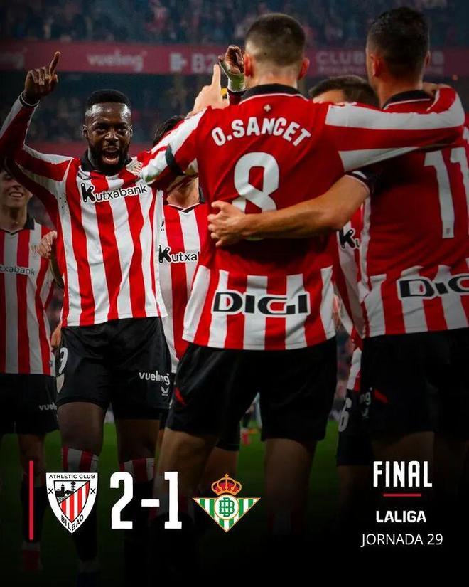 北京时间3月23日凌晨1点30分,毕尔巴鄂竞技主场迎战皇家贝蒂斯。上半场比赛,伊尼亚基·威廉斯回做,维维安远射先下一城,随后前者带球扫向门前,桑切特包抄破门扩大比分,福尔纳尔斯精彩任意球扳回一城。最终,毕尔巴鄂竞技2比1击败皇家贝蒂斯,送对手联赛5轮不胜。
