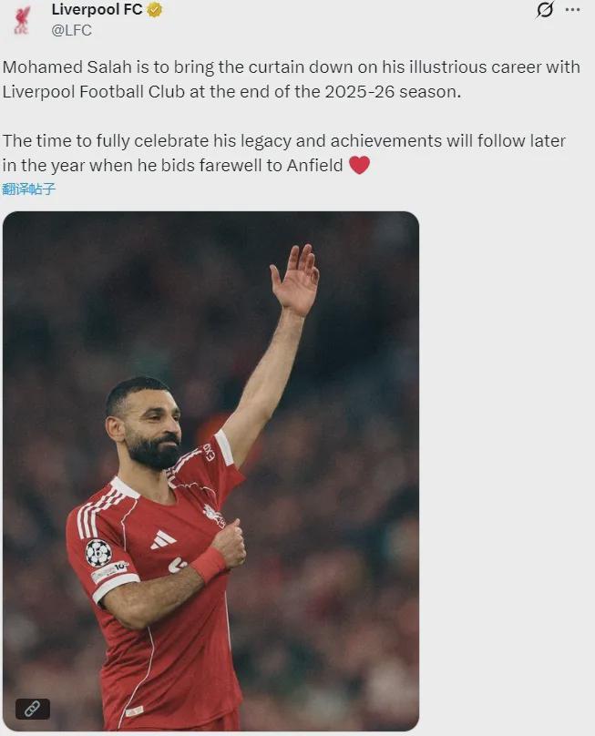官方:利物浦宣布萨拉赫将在本赛季结束后离队,结束其9年红军生涯,这是双方讨论后达成的共识。
