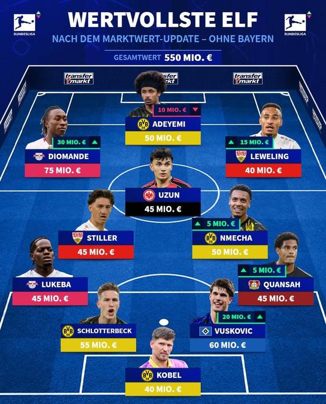 北京时间3月21日,在更新了德甲球员的身价之后,德转还列出了更新之后德甲无拜仁球员的最贵11人阵容,扬-迪奥曼德7500万欧元领衔,阿德耶米、施蒂勒、施洛特贝克入选。