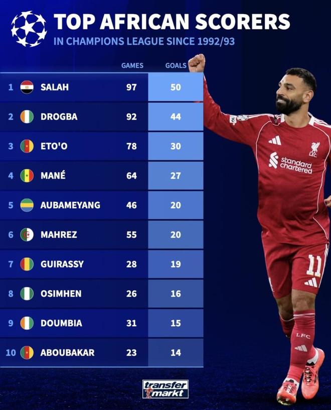 这份榜单最具含金量之处,不仅在于萨拉赫将个人总进球数推高至50大关,更在于它清晰地勾勒出了非洲球员在欧冠赛场上的三大维度。