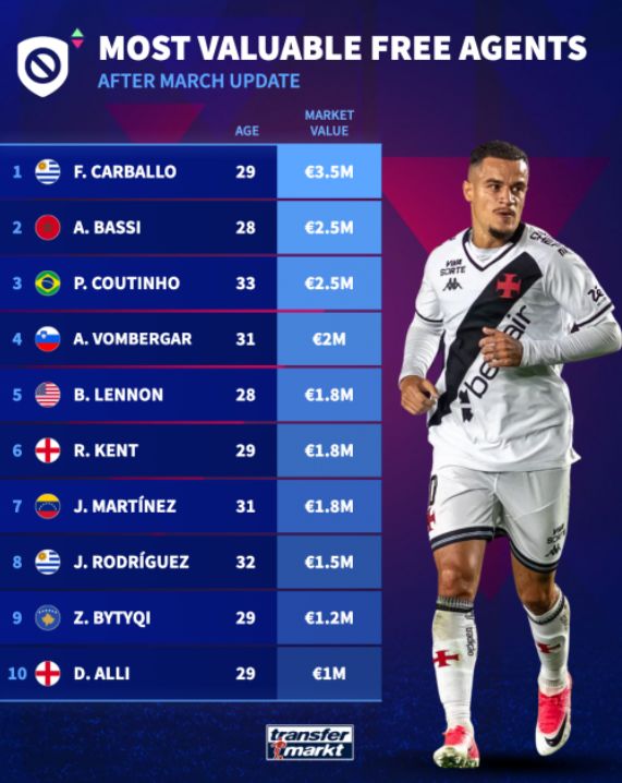 接下来是前利物浦和巴萨的组织核心库蒂尼奥。这位巴西球员在二月离开母队瓦斯科达伽马后成为自由身。他今年33岁,目前市场身价为250万欧元。