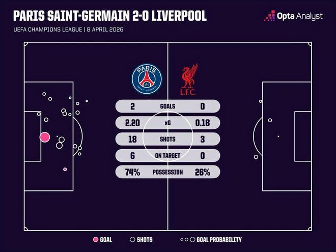 相比之下,利物浦输得还是很彻底的,虽然只是丢了2球,不过场面上的差距巨大。射门数18比3,射正数6比0,绝佳得分机会4比0,预期进球2.2比0.18,利物浦甚至达不到巴黎的一个零头。