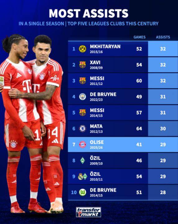 奥利塞目前排名第七,但他本赛季只需要再送出4次助攻就能打破纪录。拜仁在德甲还有六轮比赛,加上还要征战欧冠和德国杯,奥利塞破纪录看来只是时间问题。