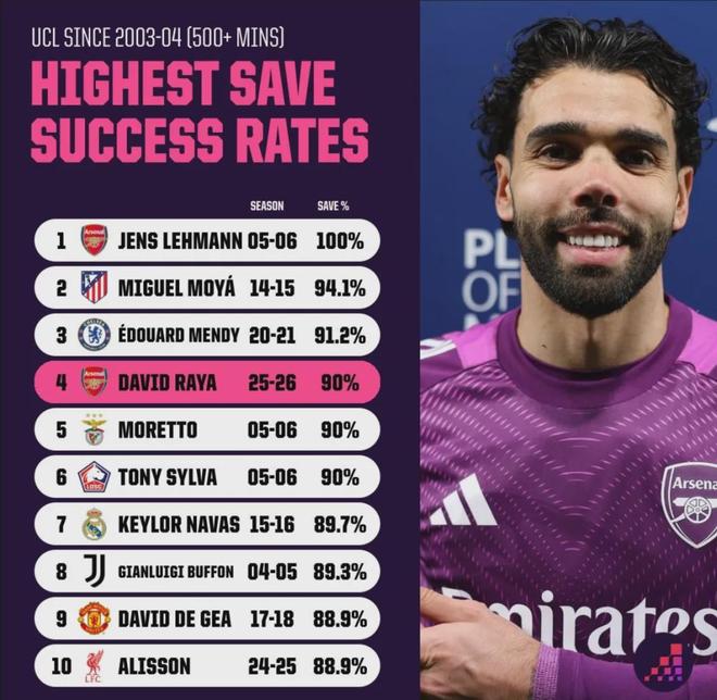 Opta统计,自2003-04赛季以来,出战500分钟以上的门将中,欧冠单赛季扑救成功率排名里,本赛季拉亚以90%的扑救成功率排在第四位。