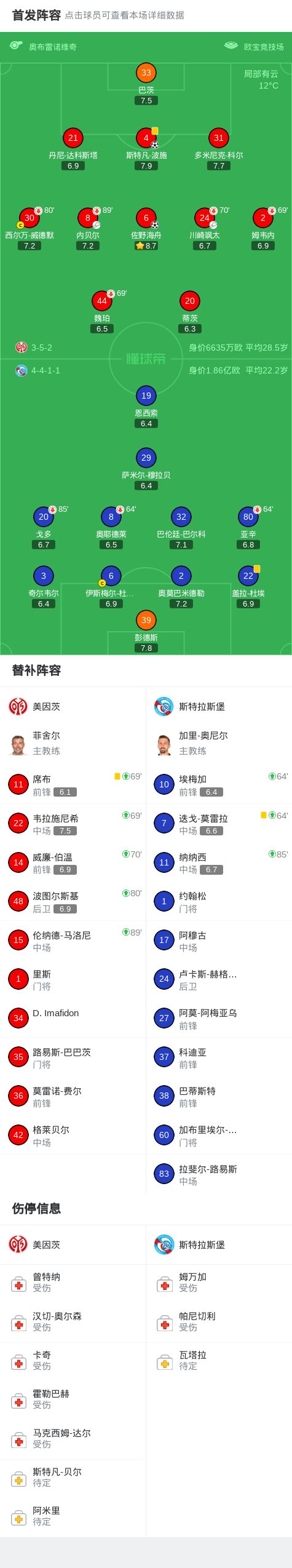 北京时间4月10日欧洲协会联赛 1/4决赛首回合,美因茨对阵斯特拉斯堡。美因茨佐野海舟破门,斯特凡-波施破门。最终比分美因茨 2-0 斯特拉斯堡。