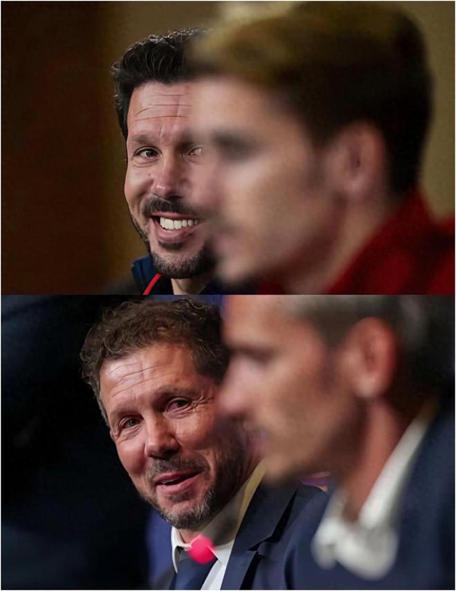 下图是近日网上流传甚广的一张拼接图,上面的图片是2016年的发布会上45岁的西蒙尼望向25岁的格列兹曼,那时两个人的脸上都还没有岁月的痕迹。下图则是前不久欧冠淘汰赛八强首回合马竞与巴萨的赛前发布会时西蒙尼真情流露,西蒙尼感谢了格列兹曼这十几年的付出,并祝他一切顺利时。